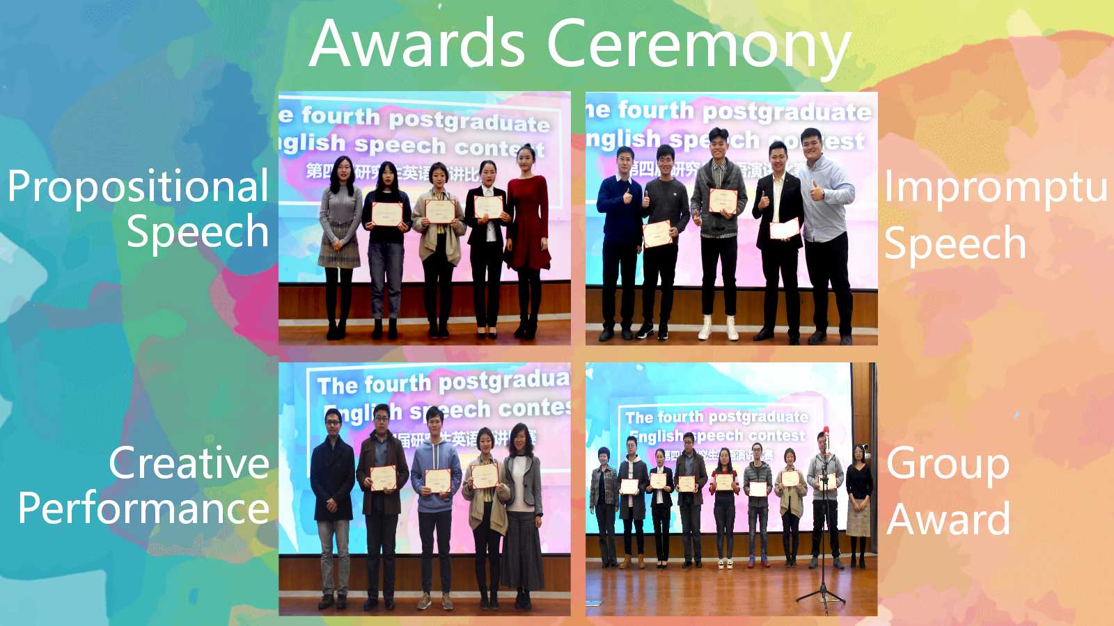本次比赛共设“自命题演讲”、“即兴演讲”和“创意表演”三个环节,“自命题演讲”的主题为“改革开放40周年”。根据比赛环节的设置,每位参赛选手不仅需要熟记文稿,还需要在现场灵活发挥。大家在舞台上充分展现了自己的英语风采,给评委和观众留下了深刻的印象。